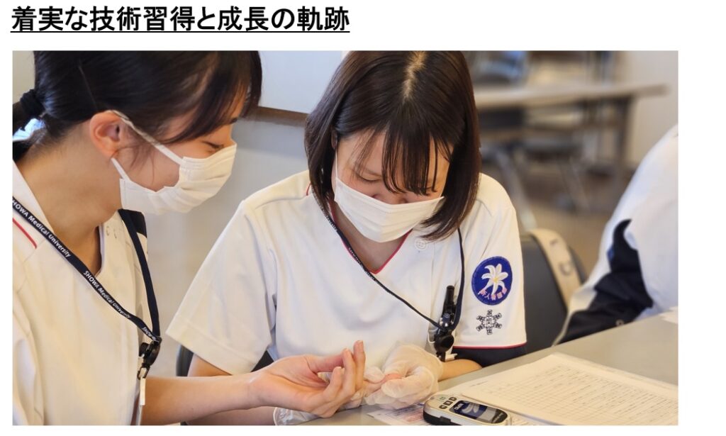 血糖測定への初挑戦では自分の指に針をチクッと刺す体験に、思わず顔をこわばらせる場面も。患者さんの気持ちを知る大切な一歩となったこの経験も、今では日常業務の一部として自然に行えるようになっています。
